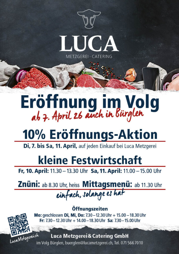Ab dem 7. April 2026 begrüssen wir Sie mit der Luca Metzgerei im Volg Bürglen